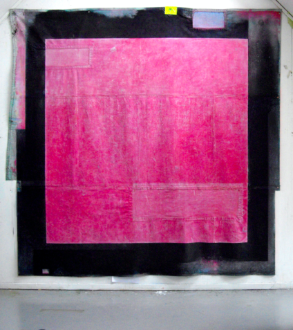 A few works that capture the textile quite literally follow using oblong compositions: Rest (2000) a portrait orientation of a white and yellow scarf, followed by Tretten til bords i Bagdad (2004) and Dag etter dag (2005) both long thin landscape compositions. But 2004 marks an aesthetic turning point in Sætrang’s practice with the introduction of the monochrome Det var en gang. (21) Starting with another large recycled tarpaulin, the drapery motif and trompe l’oeil visual games are replaced with a canvas of deep black punctuated with five tiny repair patches that act like miniature lenses into the original cloth beneath. By the end of the decade, the emotion of her work has shifted entirely. No longer subdued, the striking rose of Pink Madder Lake (2010) created from acrylic on tarpaulin is a joyful statement of colour. While the recycled tarpaulin continues to provide the canvas base with a deep black used as a frame of sorts, the heart of the work is a stunning colour field.