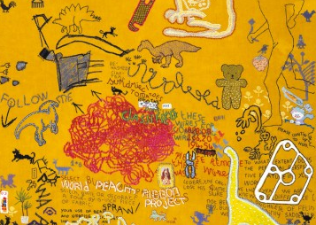 British bureaucracy enjoys a recurring presence. Free Recovery, for example, is titled after the British road signs she laughingly observes are ‘so optimistic and full of trust.’ ‘Do you really sit and wait?’ a bemused Schwarz questioned the audience gathered for her recent talk at the Centre. The installation of this exhibition continues the high standards Ruthin has established for the exhibition of craft. A complimentary show on the theme of ‘smile’ is on display nearby and sets the tone of lightness and humour which Schwarz’ embroideries thrive. Throughout, the artist’s skill is admirable. Her chosen content is not only amusing, but also able to sustain prolonged reading. And the work is beautiful.